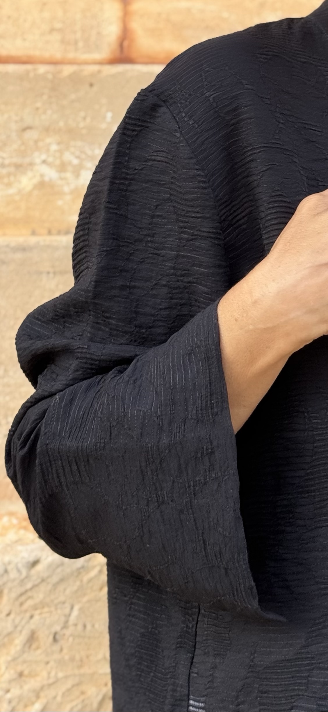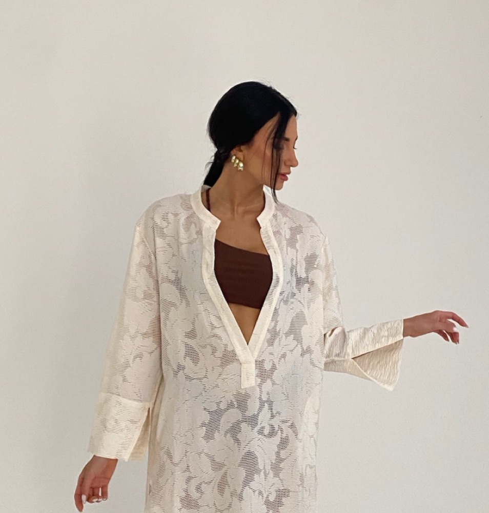 Caftano corto in tessuto di seta jacquard con motivi floreali tinta su tinta.