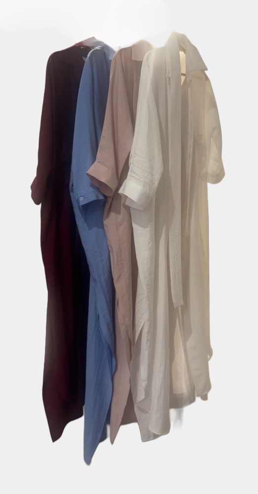 Abito stile chemisier con tastoni frontali realizzato in cotone stropicciato, modello oversize.