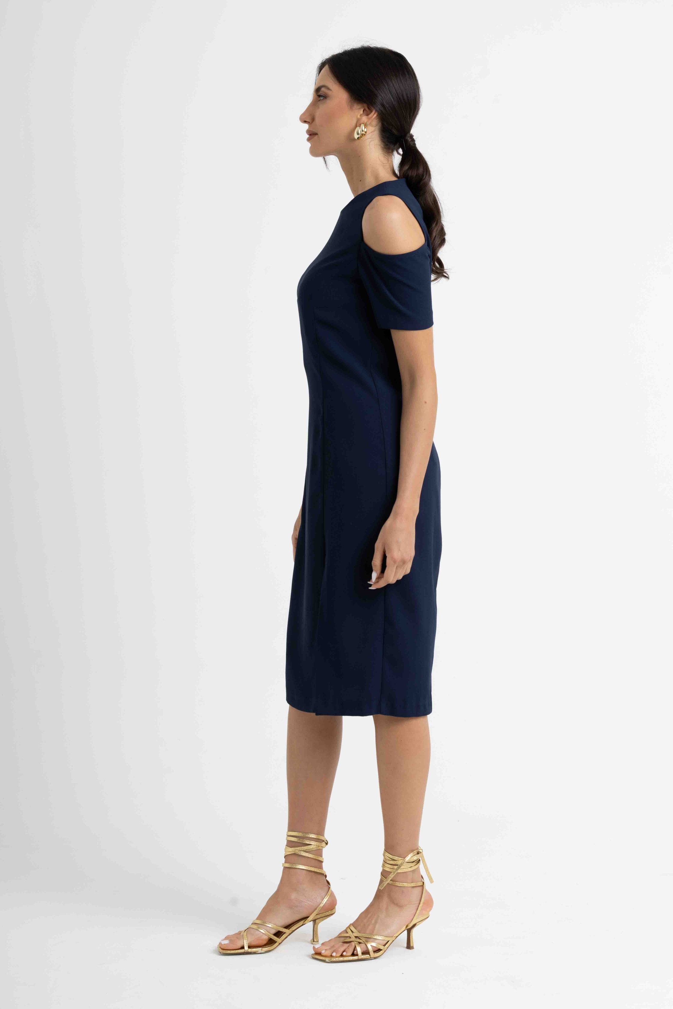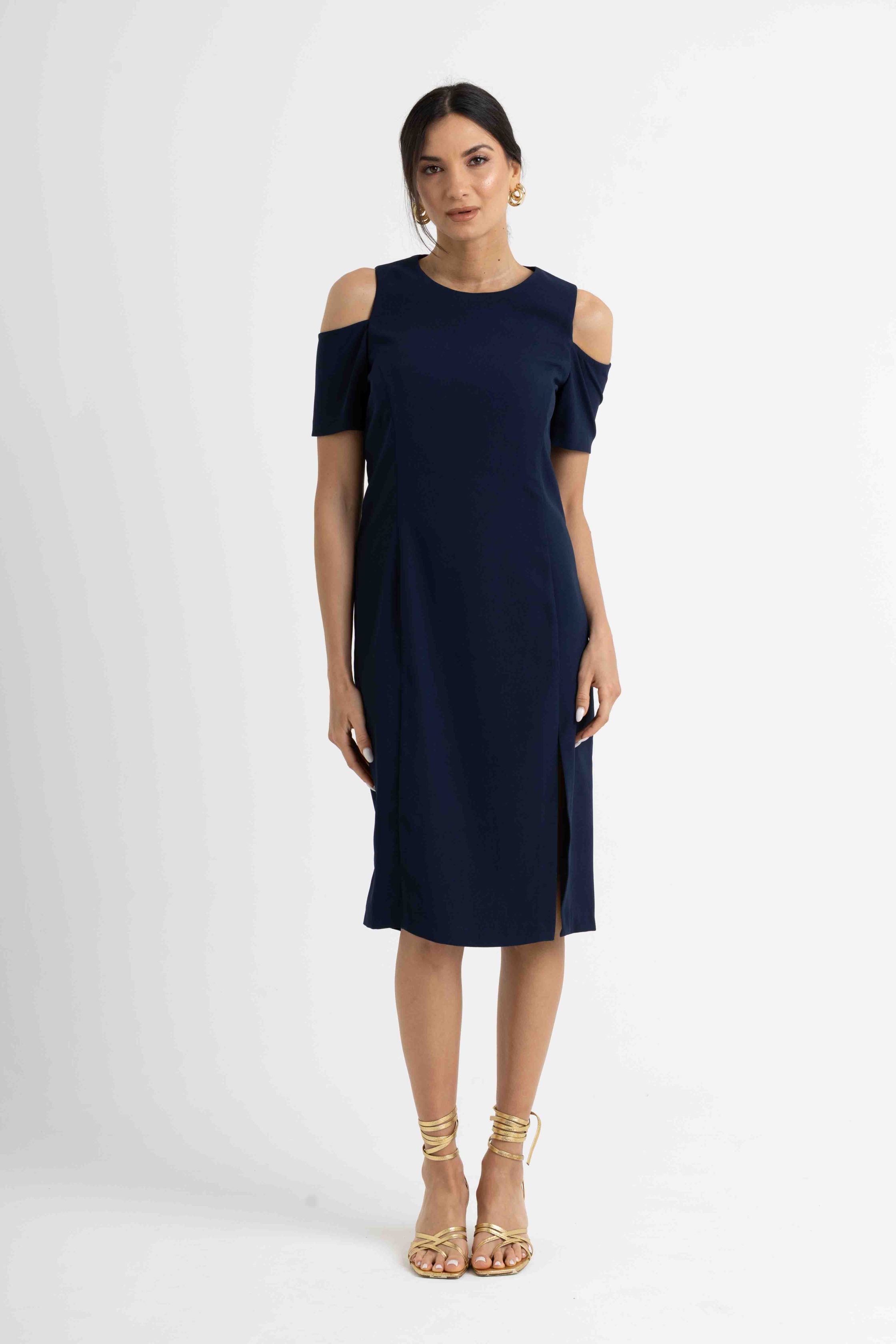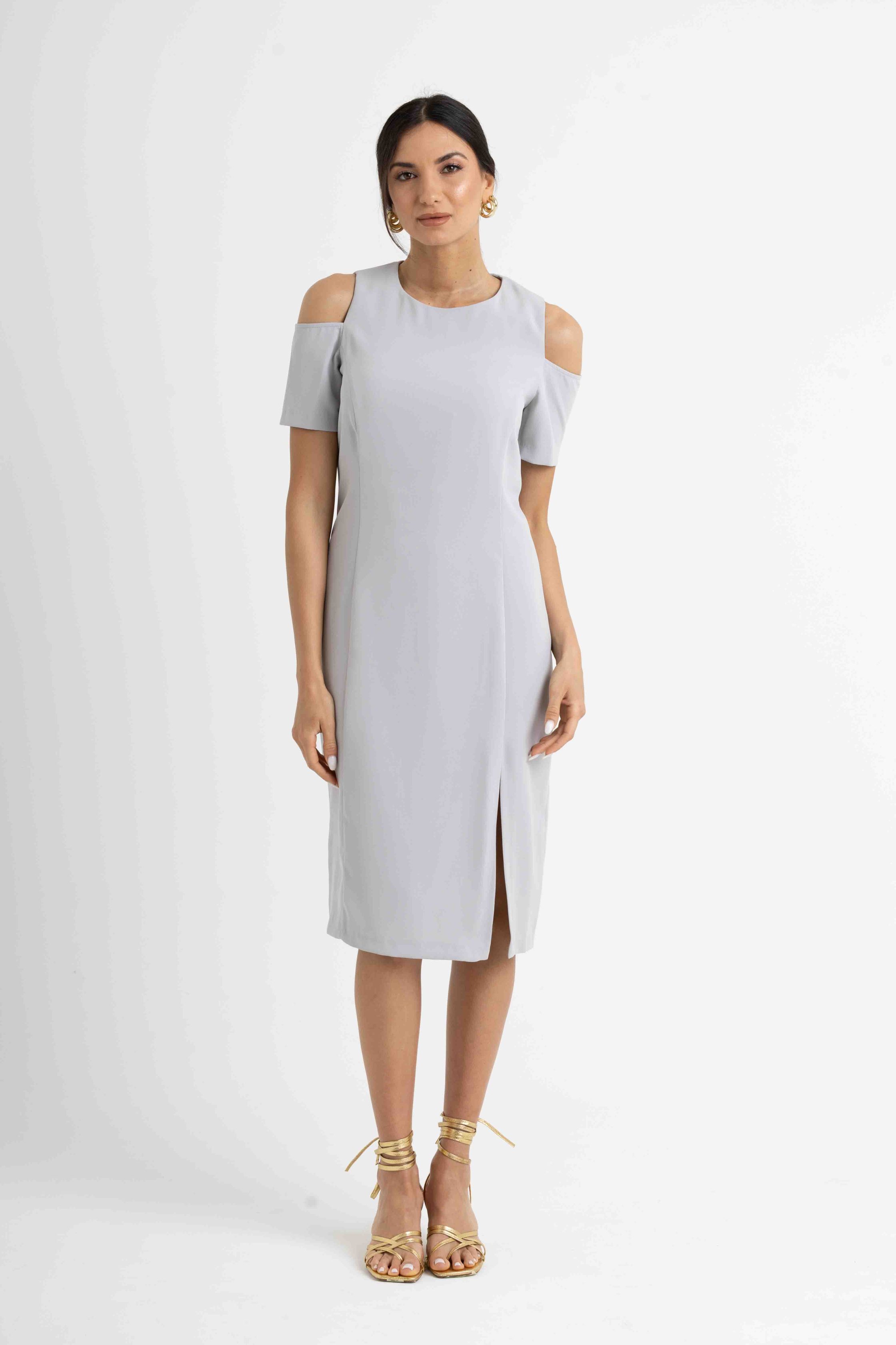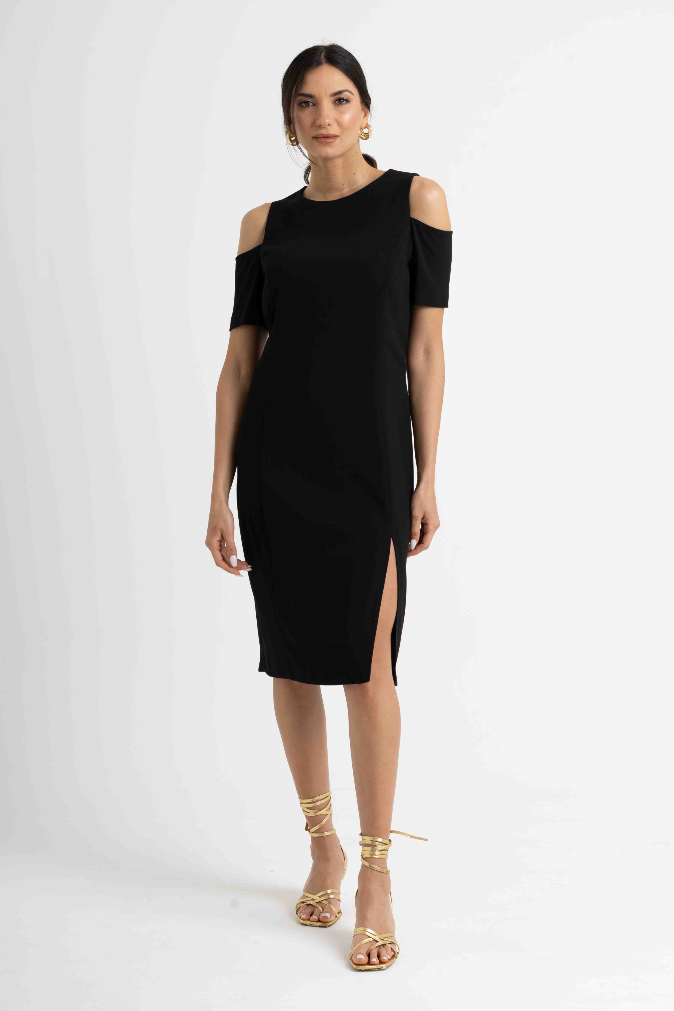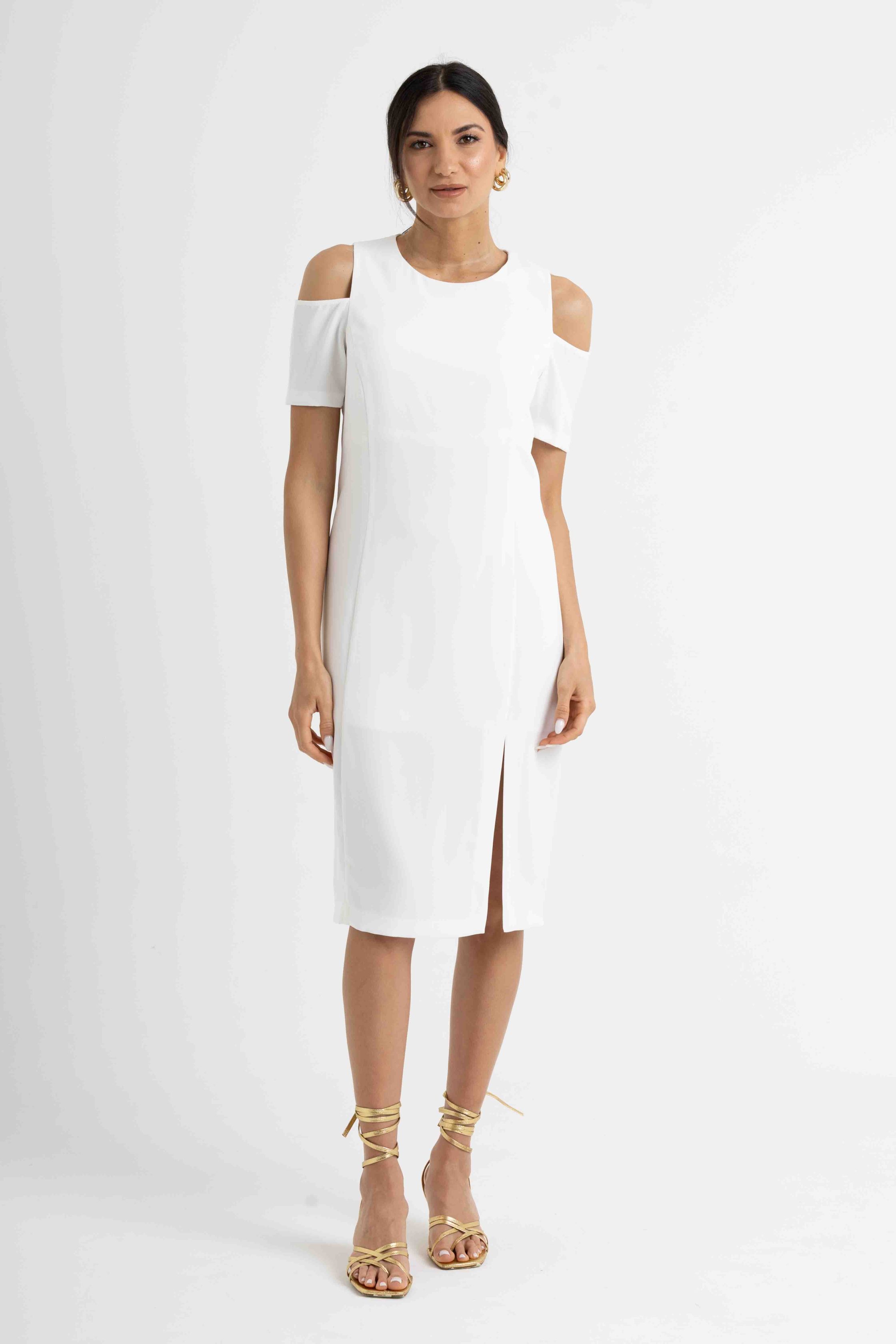 Abito midi con spacco avanti e dettaglio della spalla scoperta.