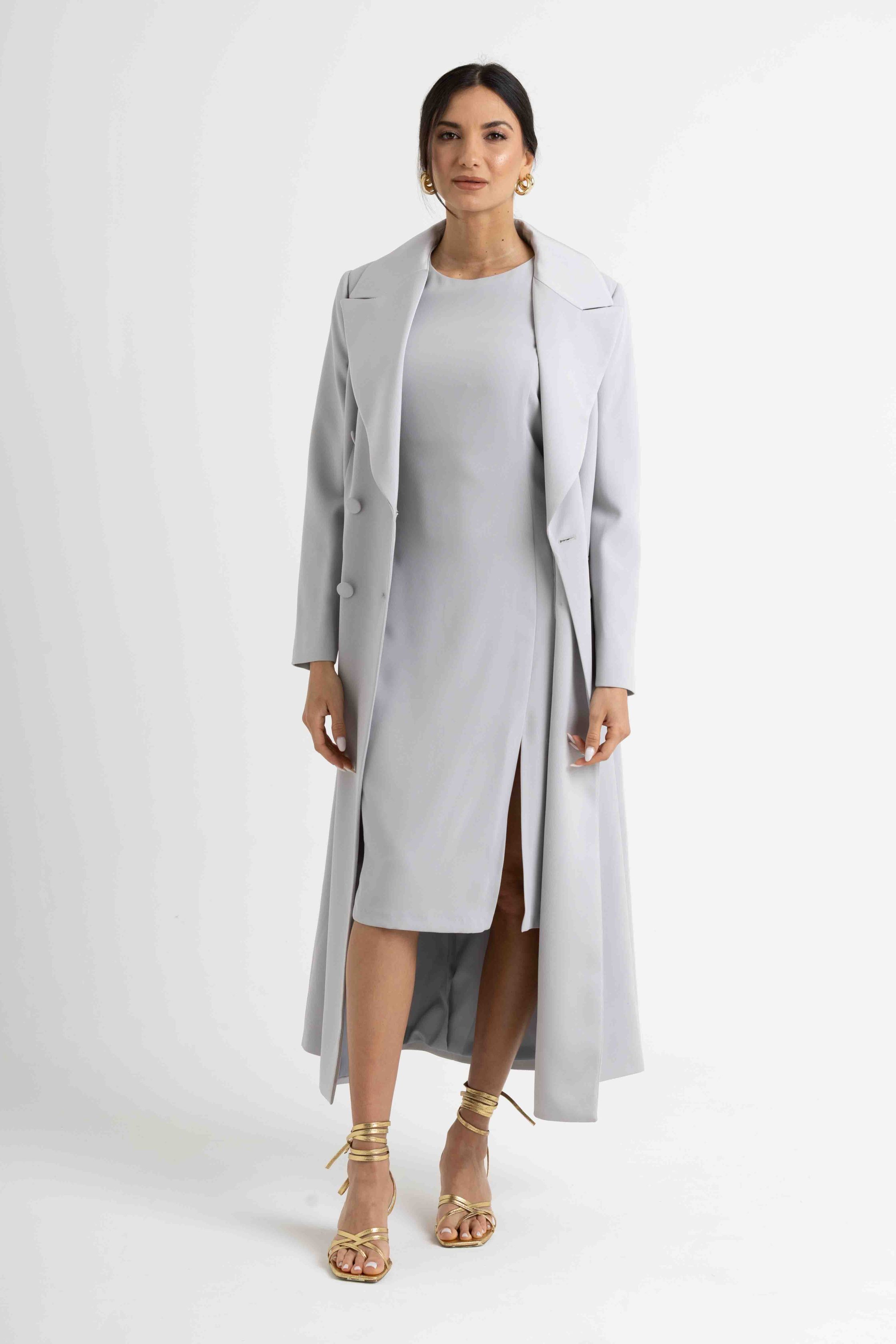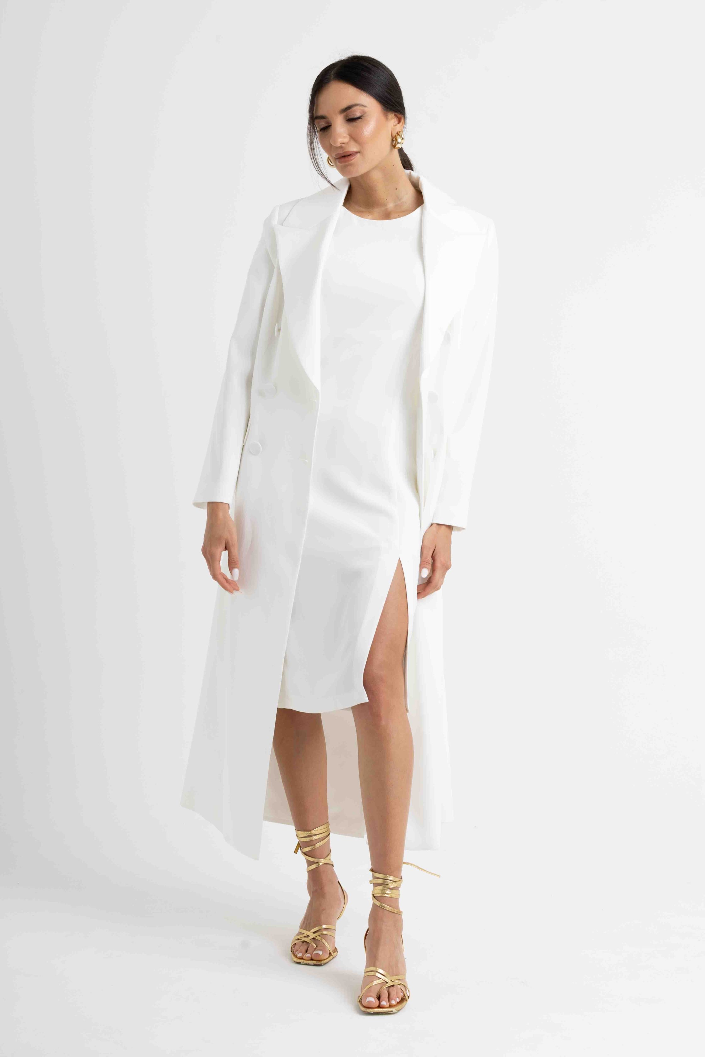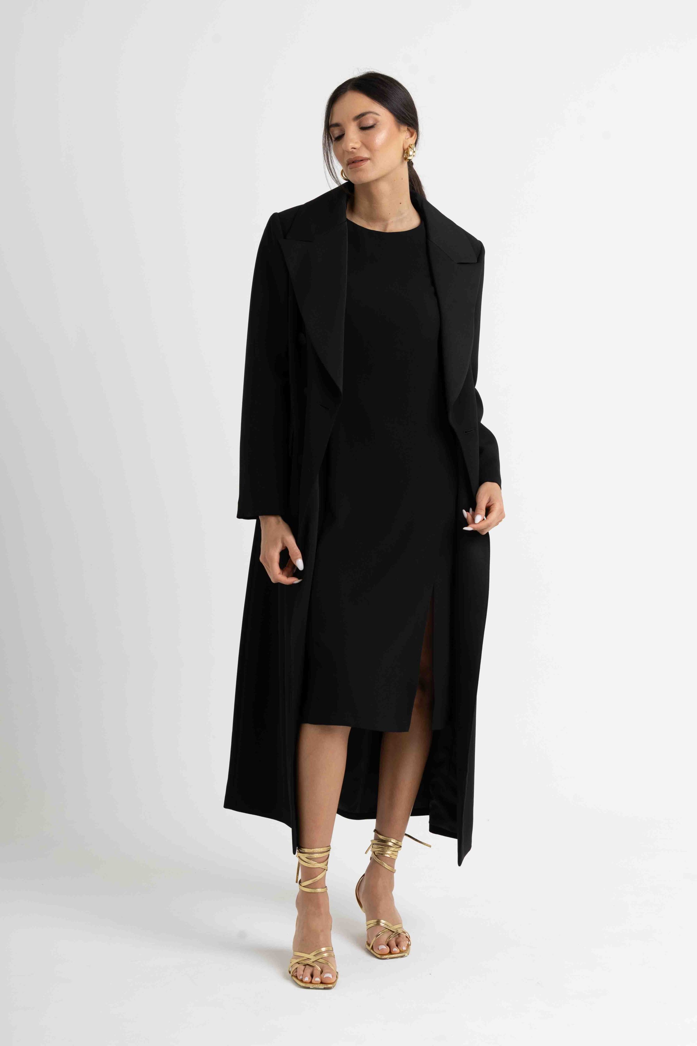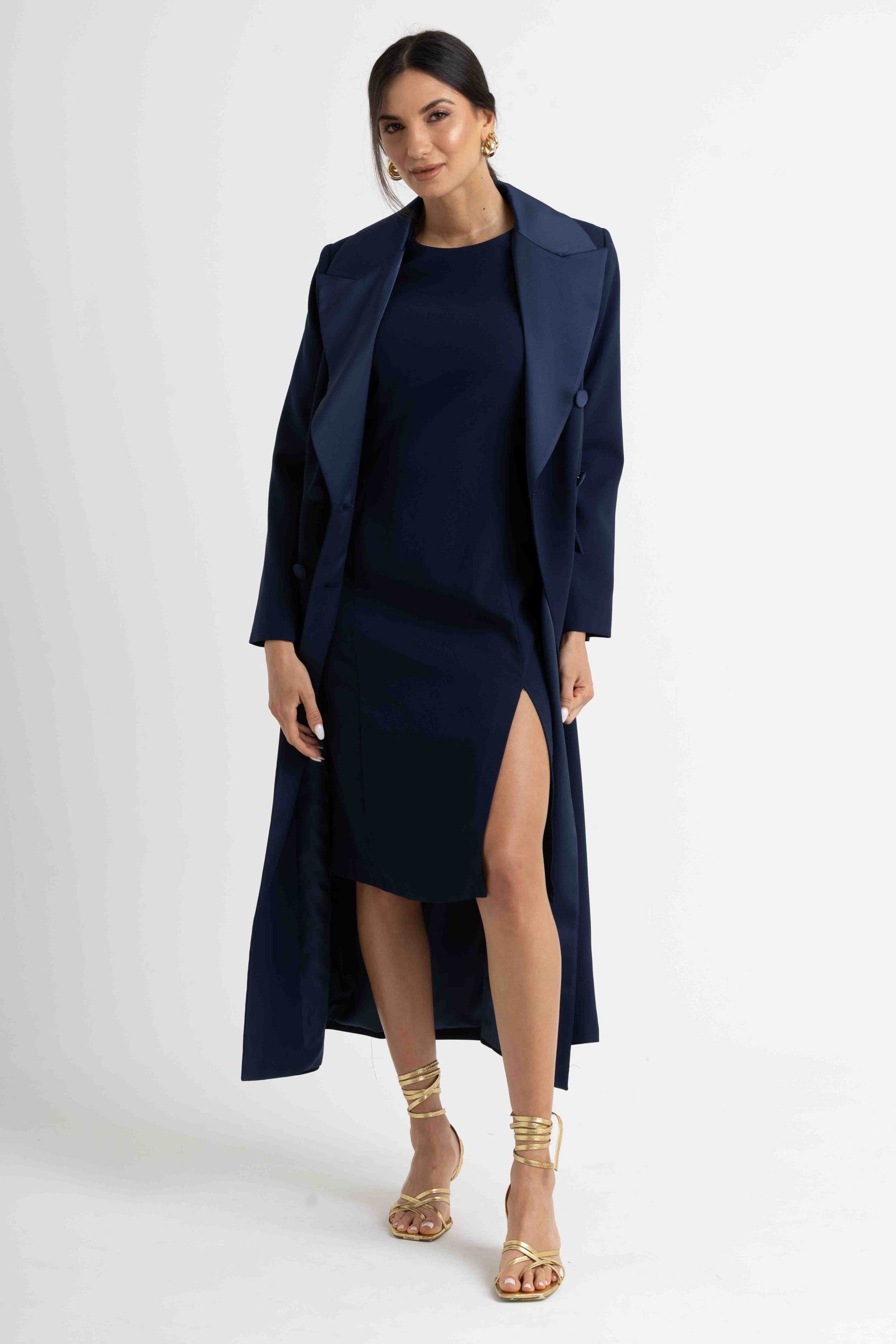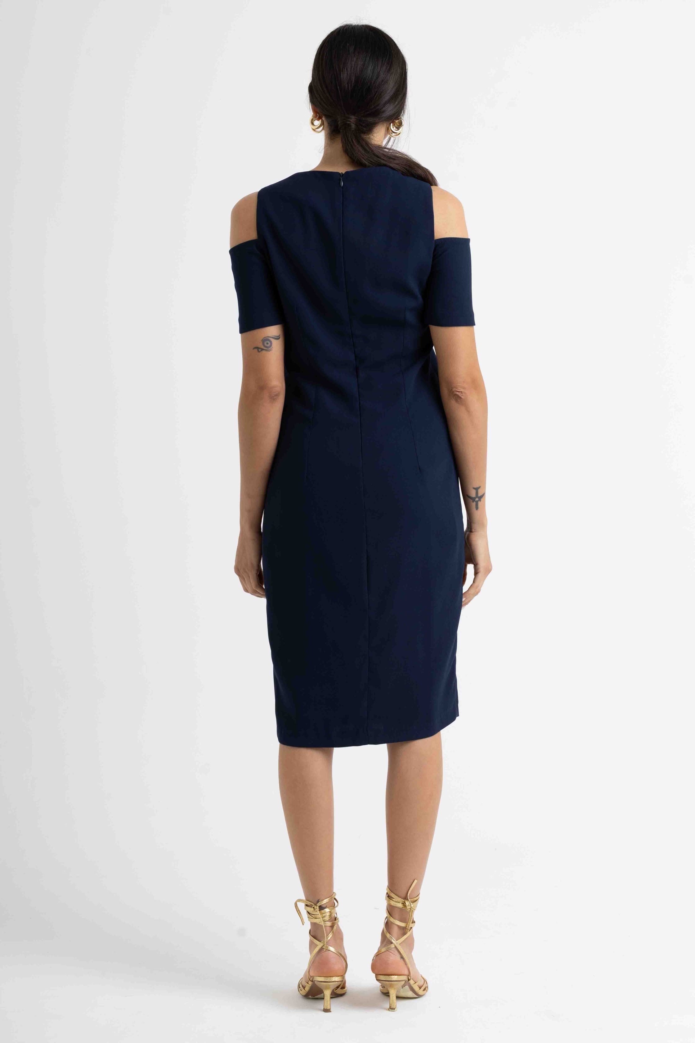 Abito midi con spacco avanti e dettaglio della spalla scoperta.