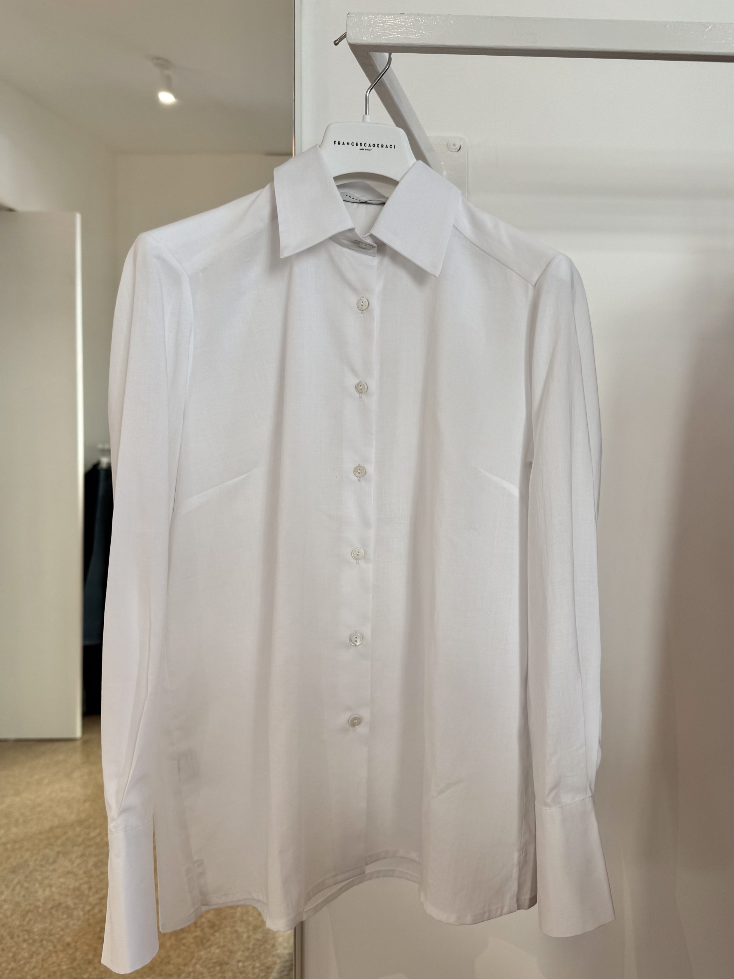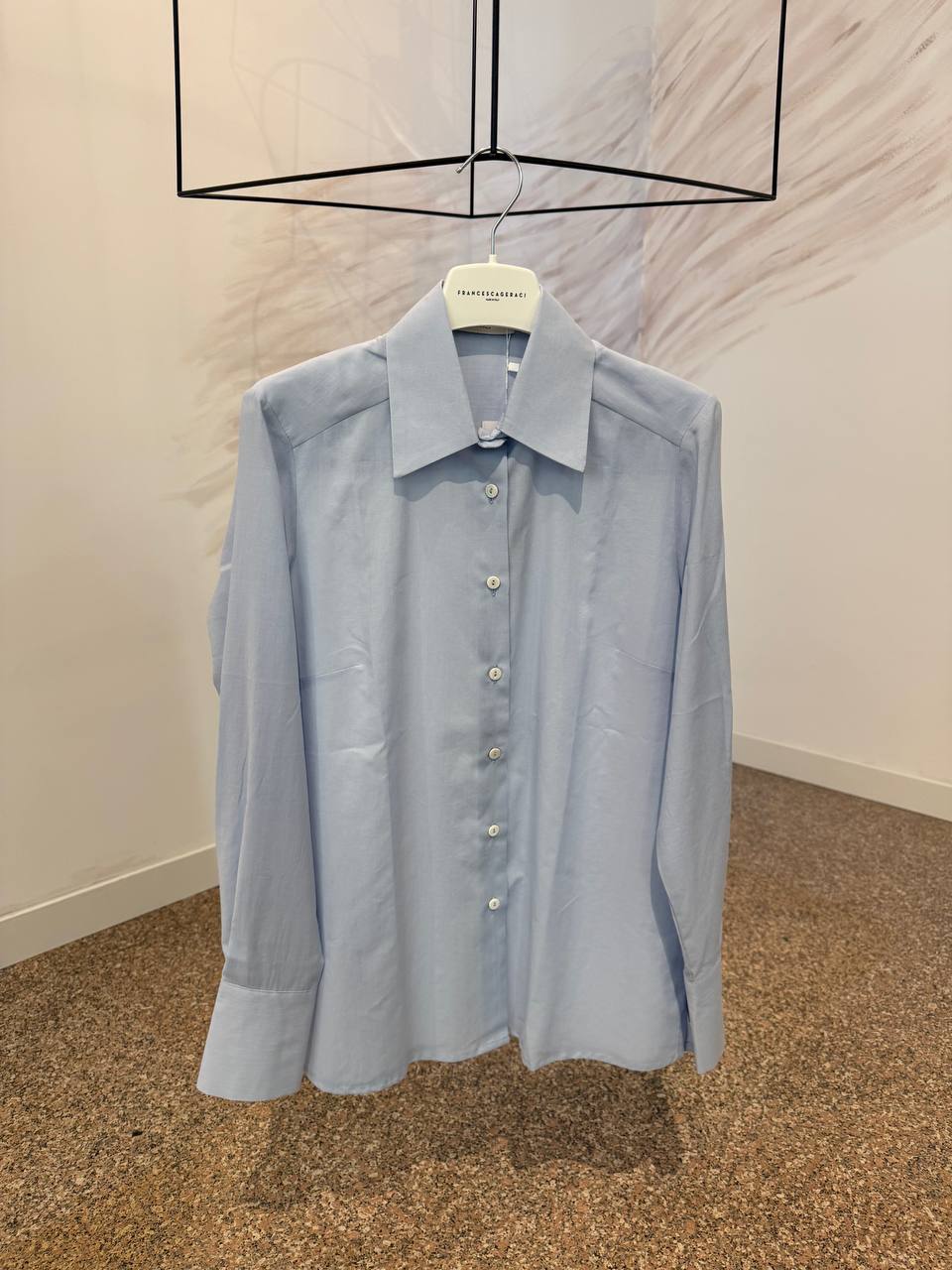 Camicia a maniche lunghe da donna in stile maschile, in cotone, con colletto classico. Una linea morbida con fondo dritto e spacchetti laterali di circa 6 cm. Presenta dettaglio piega posteriore sul carré. La chiusura anteriore e polsini sono dotate di bottoni bianchi in madreperla brandizzati.